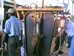 As needed, we work the cattle through our hydraulic vet chute. We can
